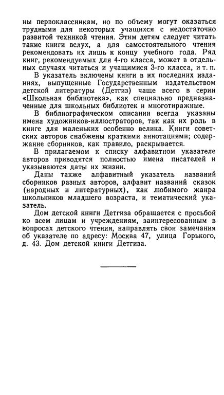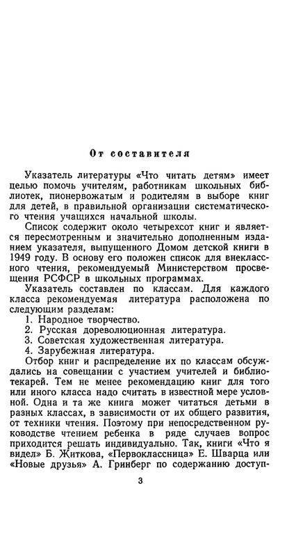 Указатель литературы 'Что читать детям' имеет целью помочь учителям, работникам школьных библиотек, пионервожатым и родителям в выборе книг для детей, в правильной организации систематического чтения учащихся начальной школы.Список содержит около четырехсот книг и является пересмотренным и значительно дополненным изданием указателя, выпущенного Домом детской книги в 1949 году. В основу его положен список для внеклассного чтения, рекомендуемый Министерством просвещения РСФСР в школьных программах.Указатель составлен по классам.