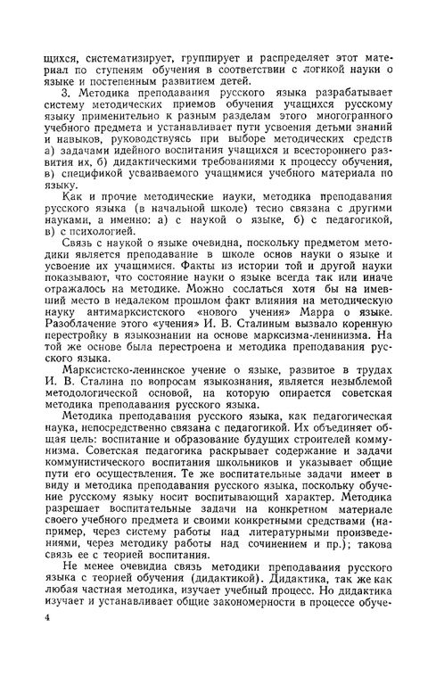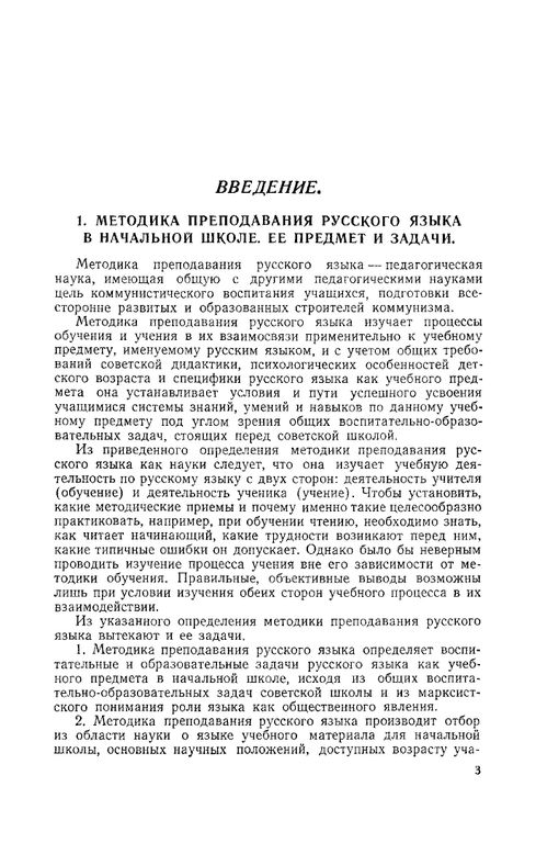 Методика преподавания русского языка изучает процессы обучения и учения в их взаимосвязи применительно к учебному предмету, именуемому русским языком, с учетом общих требований советского образования, психологических особенностей детского возраста и специфики русского языка и пути успешного освоения предмета и задач, стоящих перед советской школой.