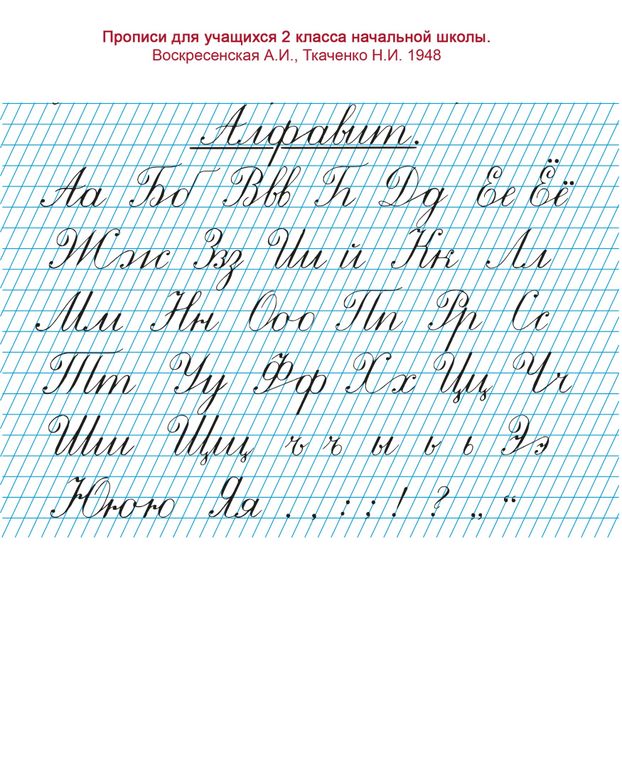 Используется во 2-ом классе в I полугодии (связное письмо средней величины, безотрывное и плавное), в том числе в комплекте с Прописями для учащихся 2 класса начальной школы. Воскресенская А.И., Ткаченко Н.И. 1948ХарактеристикиОбъём, стр.: 12Цветные иллюстрации: нетВес, кг: 0,062Год издания (оригинал): 2020