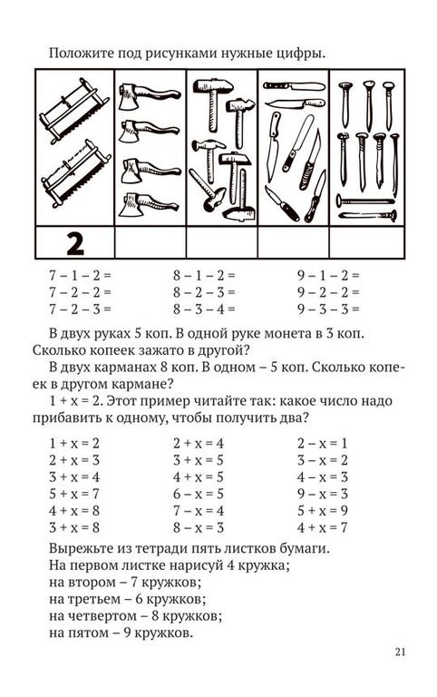 Перед вами наглядное пособие с простыми и увлекательными задачами для первоклассников, которые учатся считать и только осваивают основные математические правила. Книга условно разделена на две части: первая состоит из иллюстраций и посвящена знакомству с числами первого десятка, вторая представляет собой сборник заданий на сложение, вычитание, умножение и деление однозначных и двузначных чисел. Чтобы ребенок не запутался в материале, иллюстрации к нему отрисованы четко, крупно и понятно. Благодаря этой книге ученик также узнает основные единицы измерения длины, веса, объема, времени и денег. В конце приведены задачи и примеры на повторение и закрепление пройденного материала. Пособие пригодится как учителям начальных классов, так и родителям, которые занимаются с детьми дополнительно.