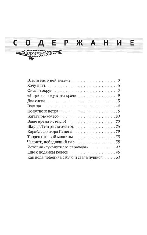 Вода окружает нас повсюду: закипает в чайнике, течет из-под крана, приводит в движение паровоз, бежит в реке, льется с неба дождем или сыплется снегом. Но что мы знаем о воде? Почему ни растение, ни животное, ни человек не могут прожить без нее? Можно ли ей управлять и как люди делали это в прошлом и продолжают делать сейчас? А как с помощью воды лечат разные болезни и укрепляют здоровье? Благодаря этой книге ваш ребенок изучит главные свойства этого уникального вещества, а также научится беречь и ценить его. Это увлекательное изложение истории воды: о том, как ее использовали в прошлом и продолжают применять сейчас в самых разных сферах: от производства техники до многокилометровых путешествий. Книга написана просто и интересно, понравится детям, интересующимся наукой, а также их родителям.