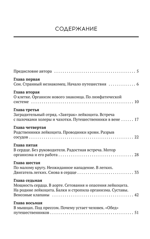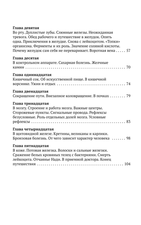 Почему синяк сначала синий, а потом — желто-зеленый? Сколько килограммов может выдержать бедренная кость? Как температура нашего тела связана с дыханием? Что такое лейкоциты и сколько их содержится в кубическом миллиметре крови? Это и многие другие любопытные факты о работе сердца, легких, мозга и других органов девочка Надя узнаёт во время увлекательного путешествия по человеческому телу. А проводником и гидом ей служит дружелюбный лейкоцит. Он знакомит ее с анатомией и физиологией человека и объясняет, почему мы растем и меняемся и как болеем и выздоравливаем. И полученные знания не выветрятся из ее головы, ведь она увидела все собственными глазами, а не услышала на скучном уроке… Написанная доступным языком, эта книга понравится детям, а ее содержание надолго останется в их памяти.